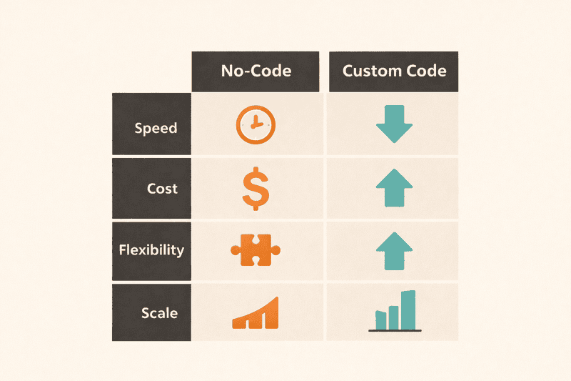 The answer isn't "always code" or "always no-code." It depends on what you're building, what you're testing, and where you're headed. Get this decision wrong and you'll either waste months coding something you could have shipped in days—or hit a wall when your no-code tool can't scale.